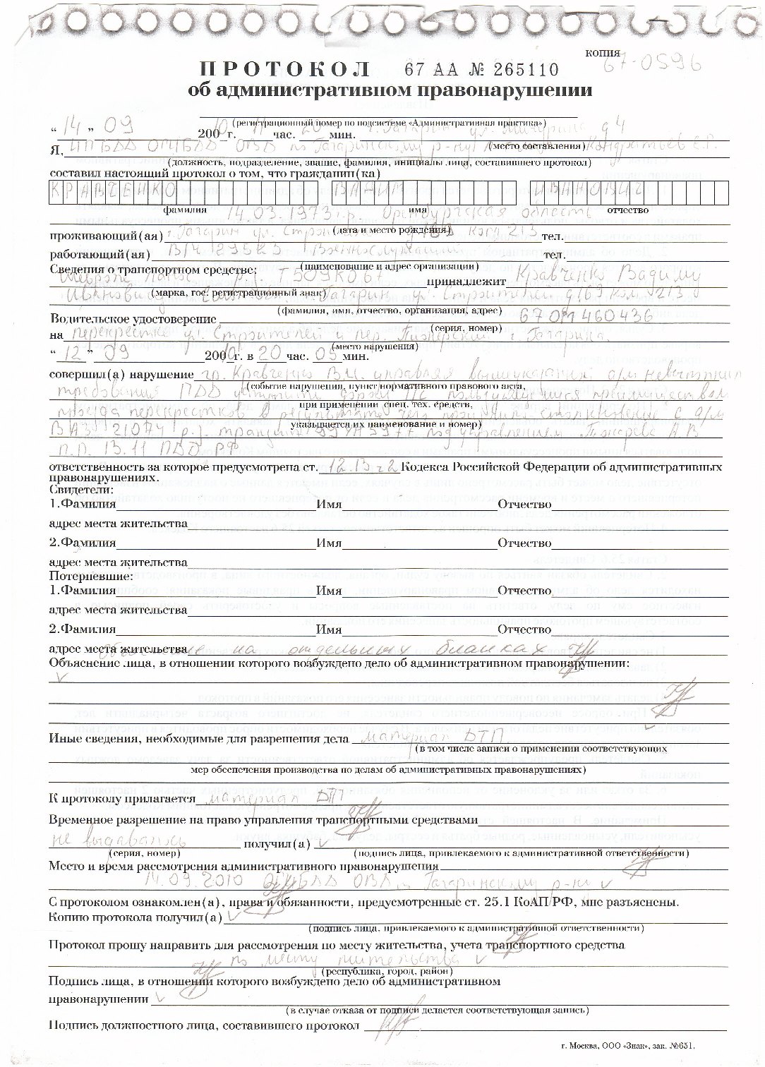 Здравствуйте! Я водитель с 19 летним стажем вождения. Жителем города являюсь с 1980 г..До этого момента в аварии не попадал. Недавно 12 сентября 2010г. попал в следующую ситуацию. Я двигался по одной из центральных улиц города - ул. Строителей. При пересечении примыкания пер. Пионерский (пер. Пионерский соединяет две центральные улицы города), справа от меня, на огромной скорости вылетел автомобиль ВАЗ 2107. Я успел затормозить и остановить свой автомобиль. Но автомобиль ВАЗ 2107 не снижая скорости пронёсся мимо меня ударившись о бампер моей машины, снес колонку водоснабжения и подлетев вверх на 2-3 метра перевернулся в воздухе несколько раз и упал на дорогу. Чудом никто в автомобиле ВАЗ 2107 не пострадал (1 водитель и 2 пассажира). Оказалось, что на пер. Пионерский, перед пересеченим с ул. Строителей, отсутствовал знак 2.4 "Уступи дорогу". Прибывшие сотрудники ДПС протокол на месте ДТП составлять не стали. Через 2 дня 14 сентября был составлен протокол в котором я был виновником ДТП и написано:"гр. Кравченко В.И. управляя вышеуказанным ам не выполнил требования ПДД уступить дорогу тс пользующемуся преимуществом проезда перекрёстков в результате чего произошло столкновение с ам ВАЗ 21074 р.з транзит 99УН5977 под управлением Токарева А.В. п.п.13.11 ПДД РФ." Подскажите пожалуйста как поступить в данной ситуации? В настоящий момент отправил жалобу в ССуд. Спасибо.